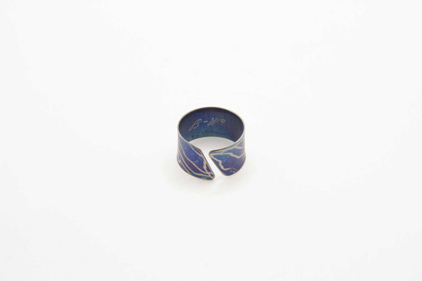 Anello semplice a fascia con apertura anteriore, in titanio ossidato e lavorato. Iniziali del logo incise all’interno
