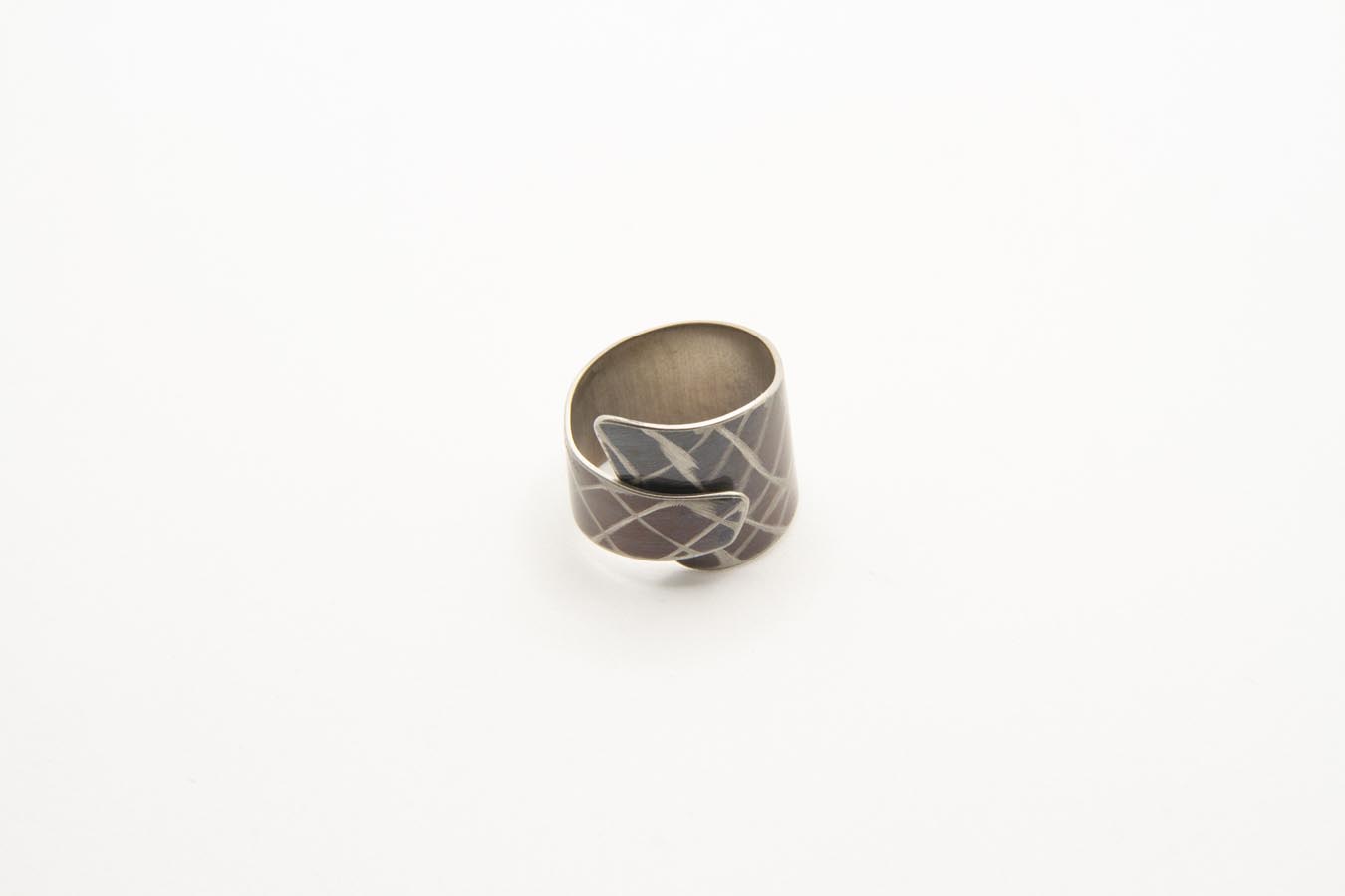 Anello con sovrapposizione realizzato in acciaio ossidato, con lavorazione