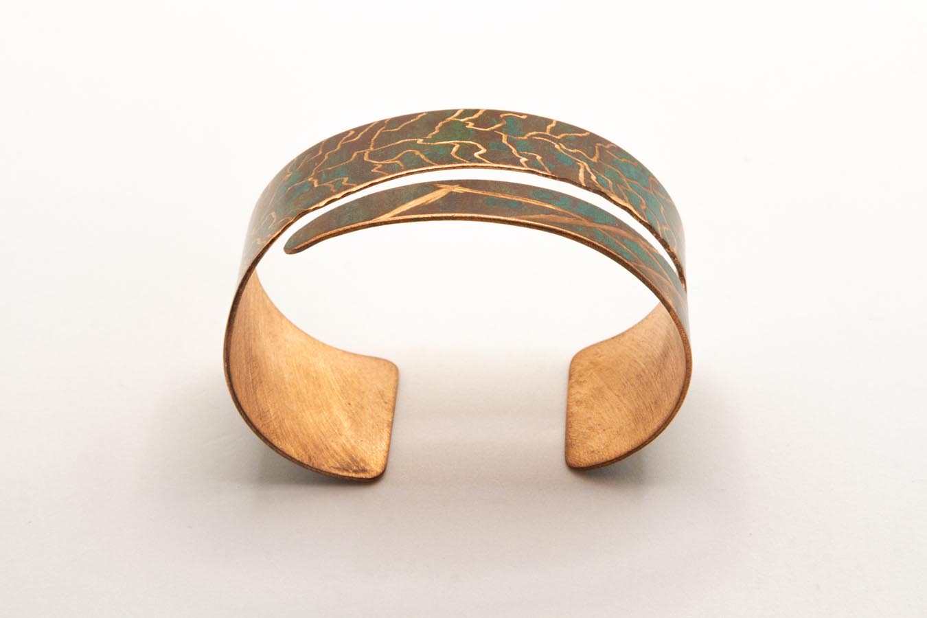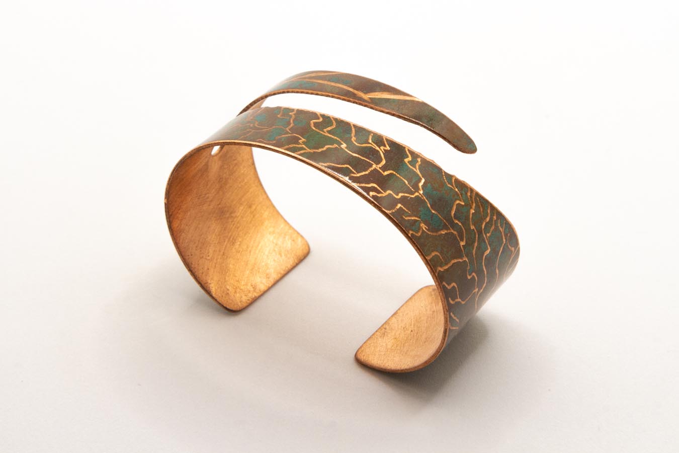 Bracciale in rame ossidato a freddo, con doppia lavorazione. La colorazione data in fase di ossidazione può variare di volta in volta. Misura grande adattabile.