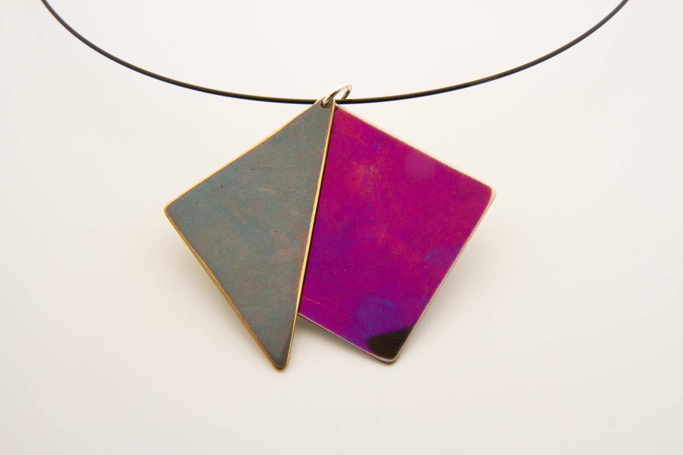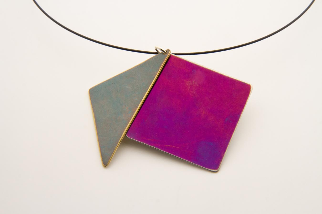Collana con pendaglio doppio mobile in acciaio più ottone. Il pendaglio base quadrato è in ottone ossidato, mentre la parte triangolare è in acciaio viola.