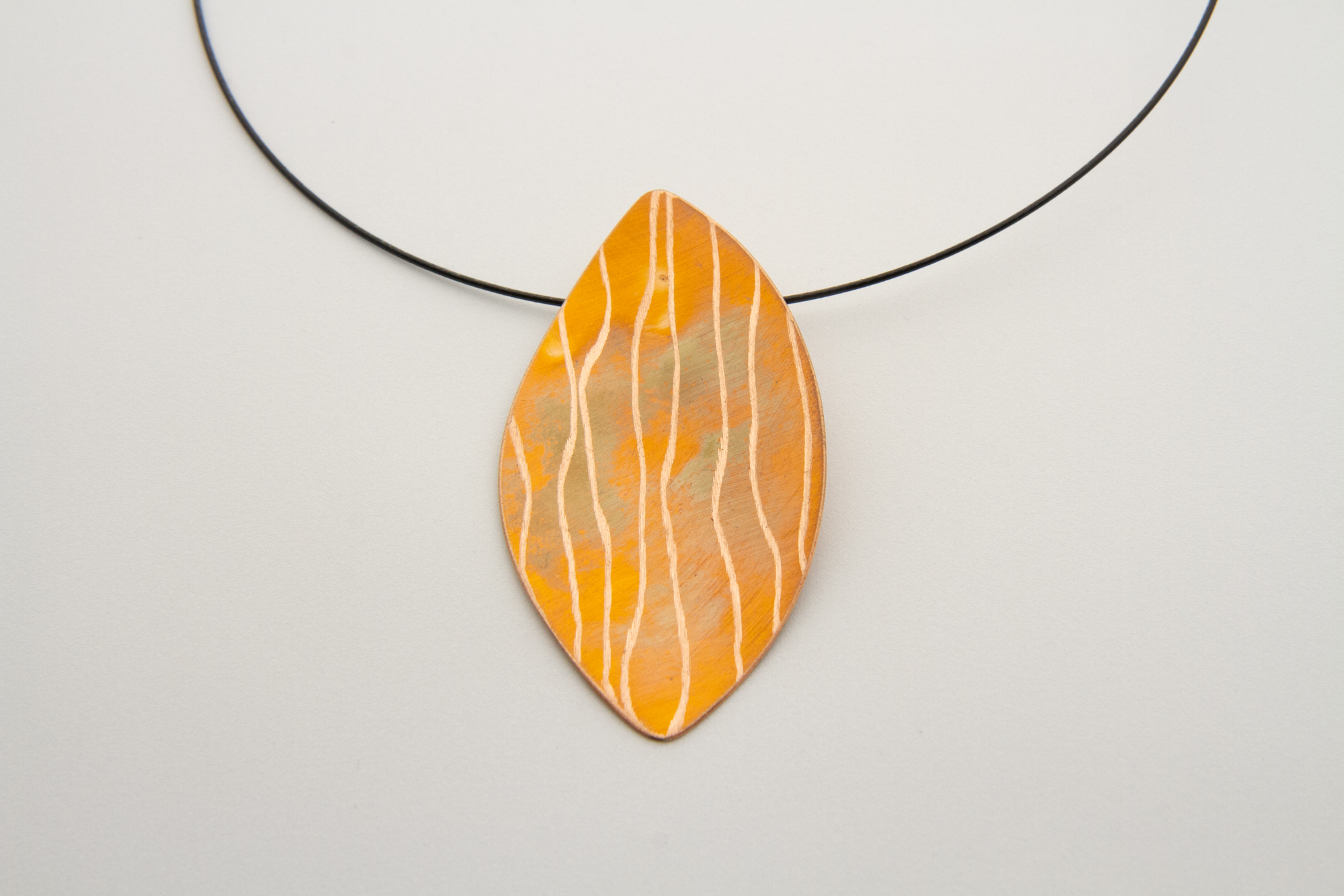 Collana con pendaglio mobile leggermente piegato, a forma di foglia, in rame ossidato a caldo, con lavorazione