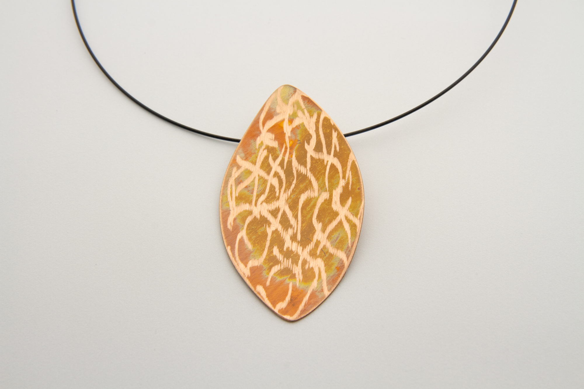 Collana con pendaglio mobile a forma di foglia, in rame ossidato a caldo e lavorato
