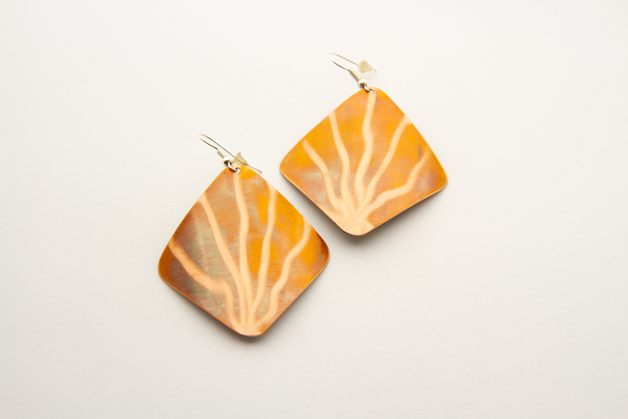 Orecchini a rombo in rame ossidato a caldo, con lavorazione. Misura grande