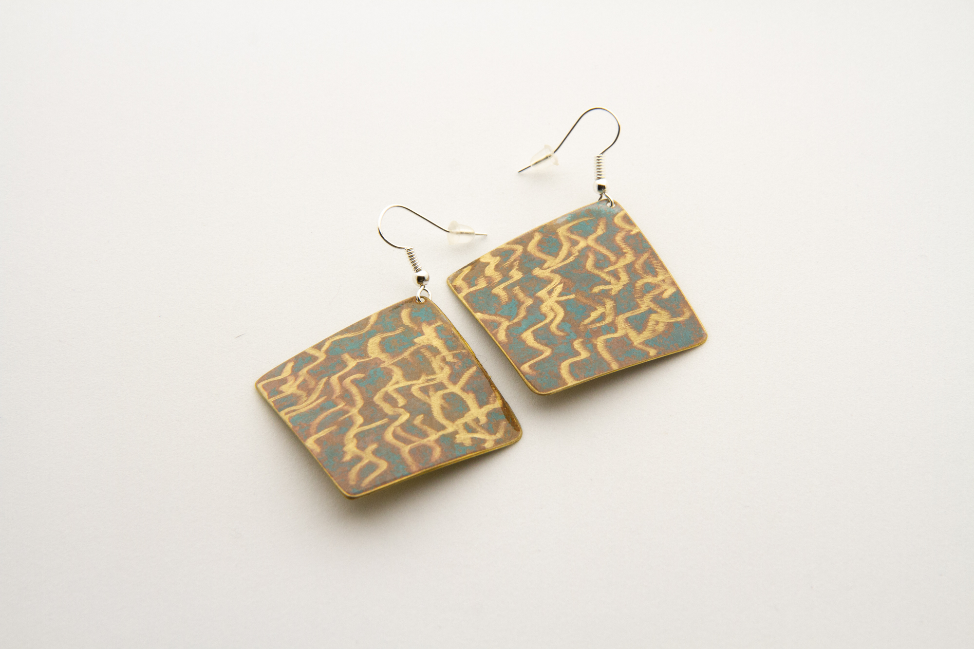 Orecchini a rombo in ottone ossidato, con lavorazione. Misura media 3,5 x 3,5 cm