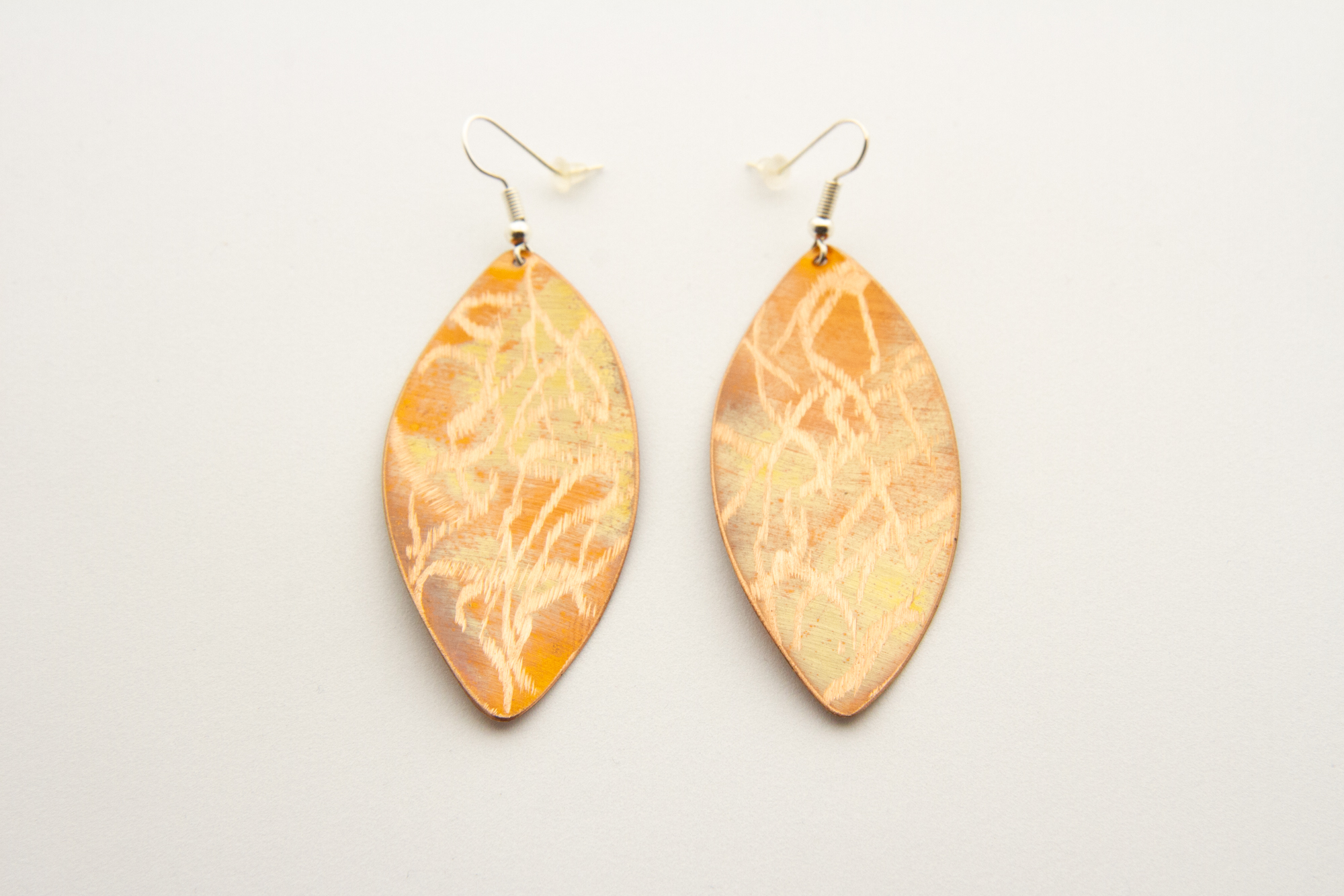 Orecchini a foglia in rame ossidato a caldo con lavorazione
