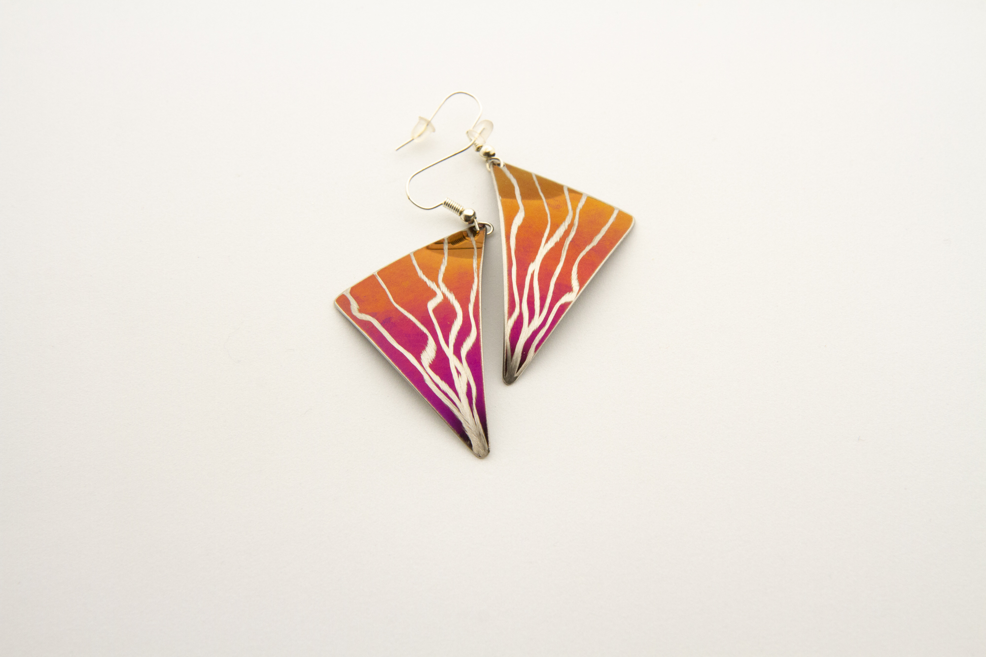 Orecchini a triangolo in acciaio viola, con lavorazione