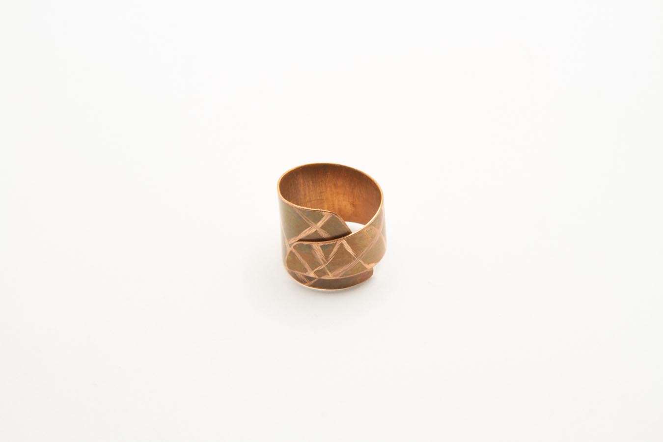 Anello con sovrapposizione realizzato in rame ossidato a caldo, con lavorazione