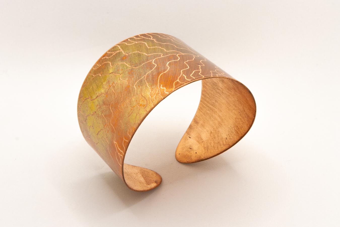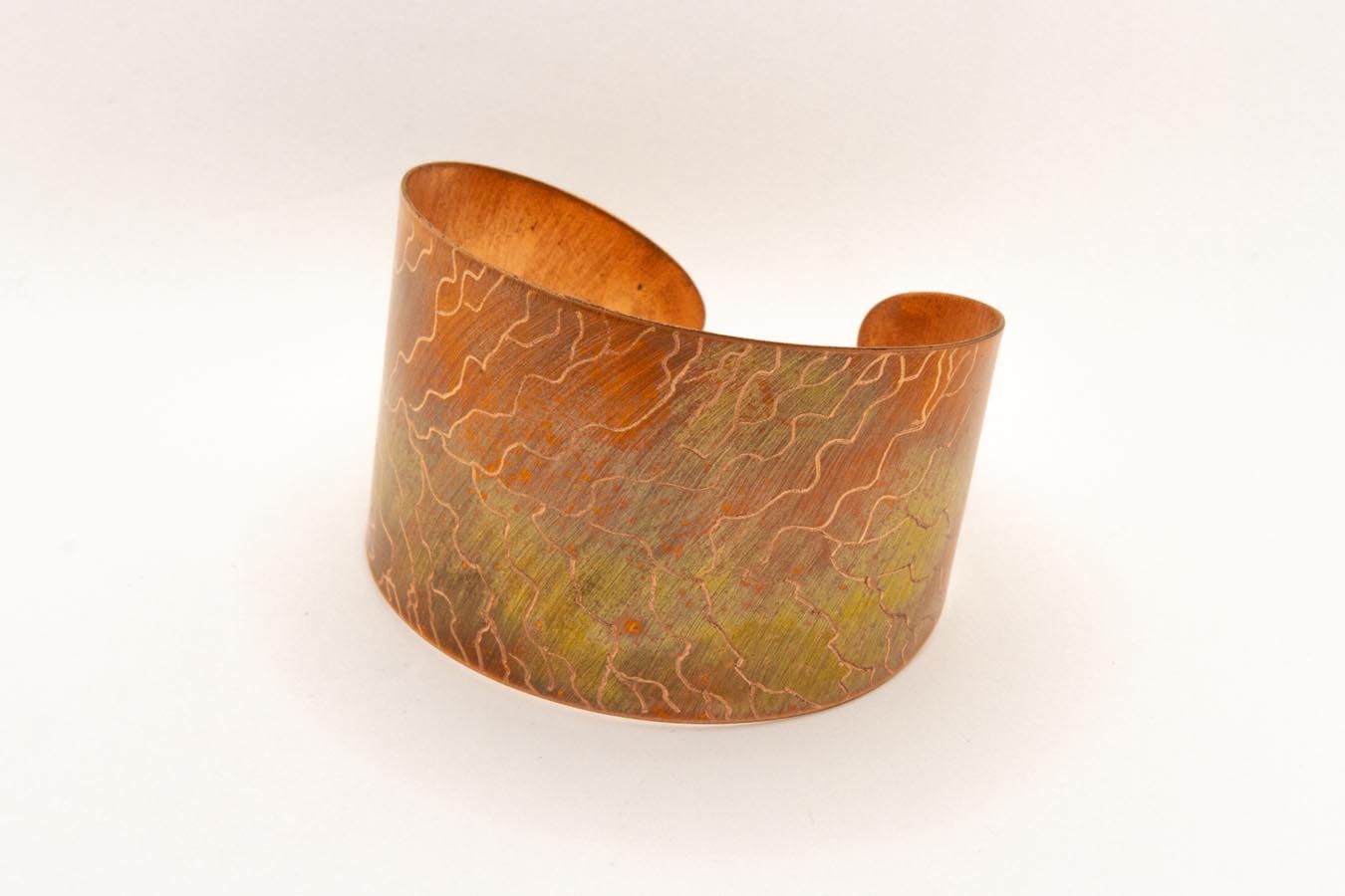 Bracciale a fascia in rame, con lavorazione ad incisione ramificata.