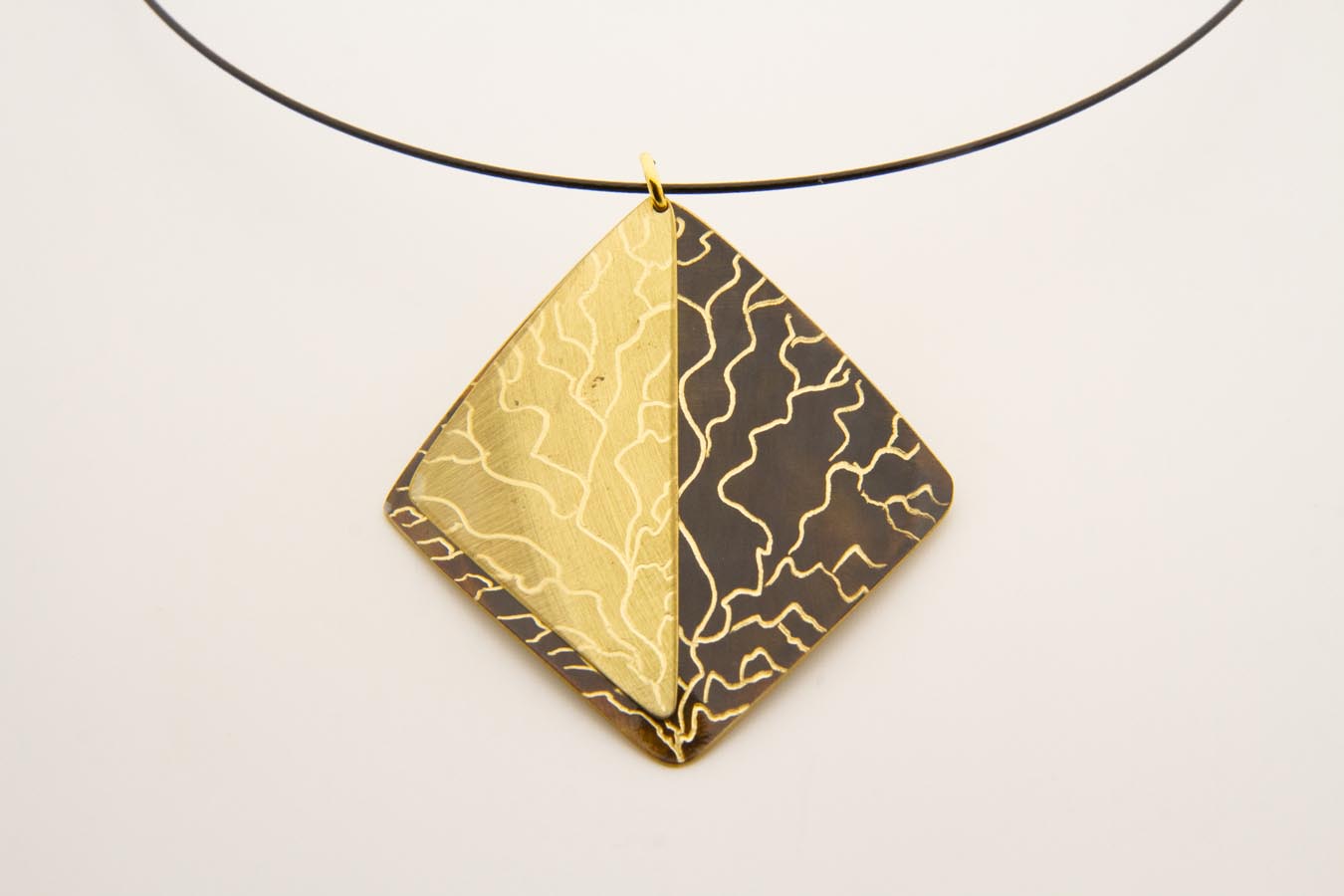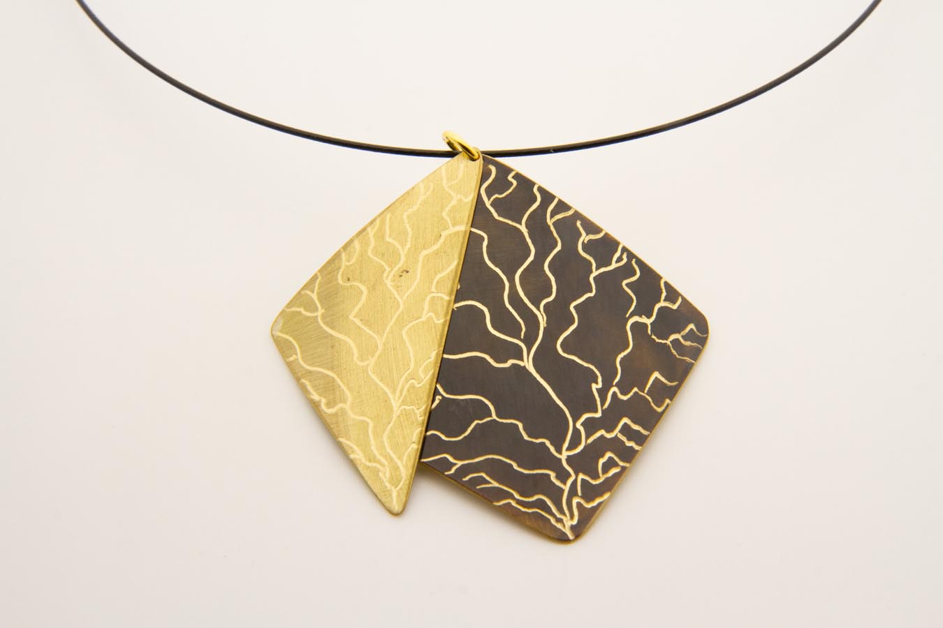 Collana con pendaglio mobile doppio in ottone ossidato ed ottone, con incisione ramificata