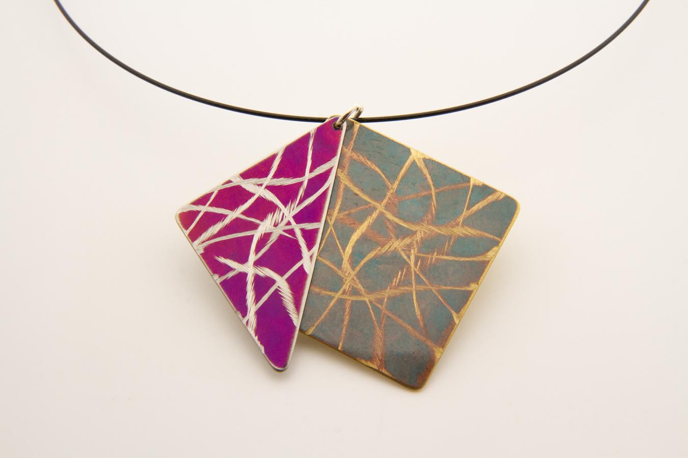 Collana con pendaglio mobile doppio con base in ottone ossidato ed un pezzo triangolare in acciaio viola, il tutto con lavorazione