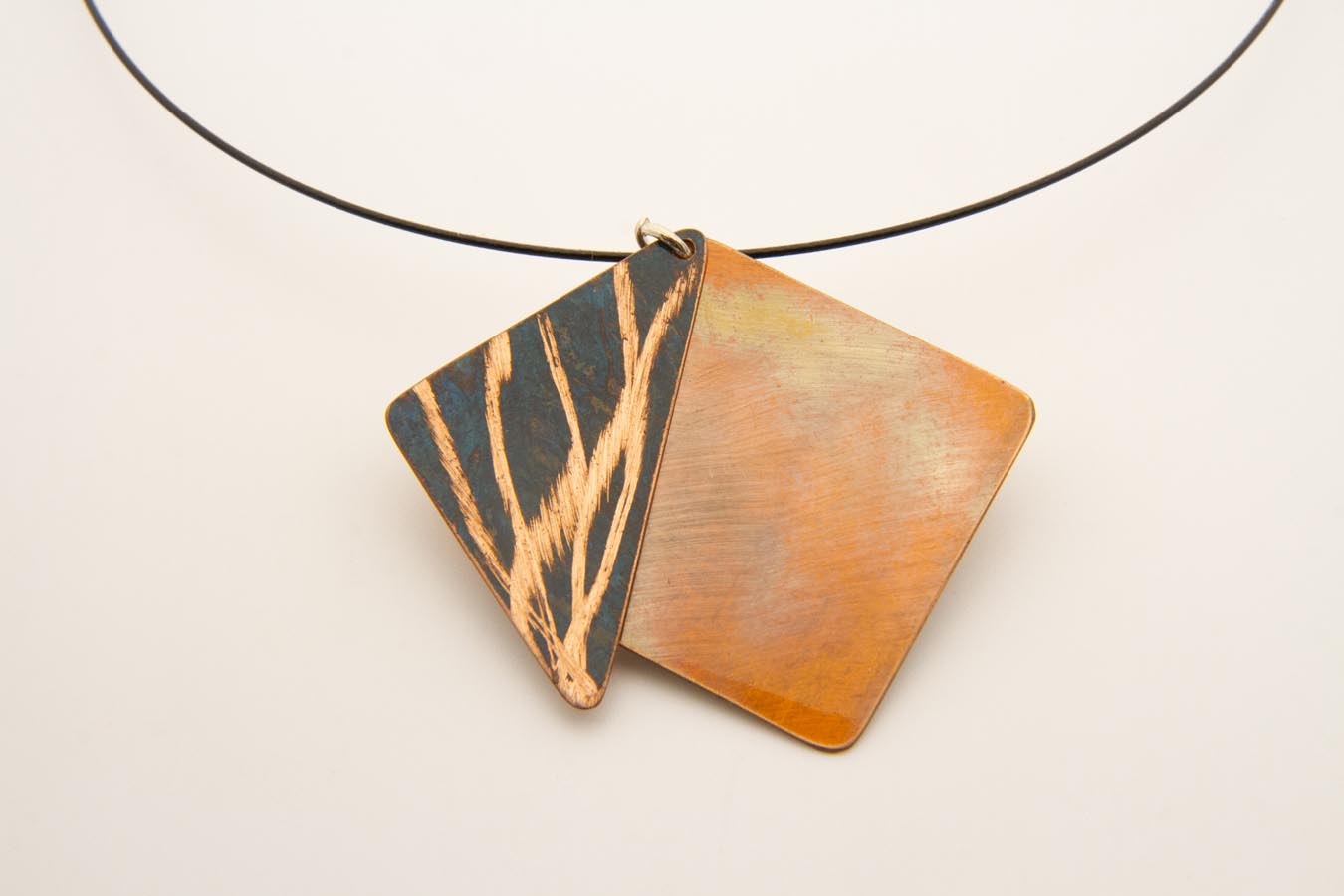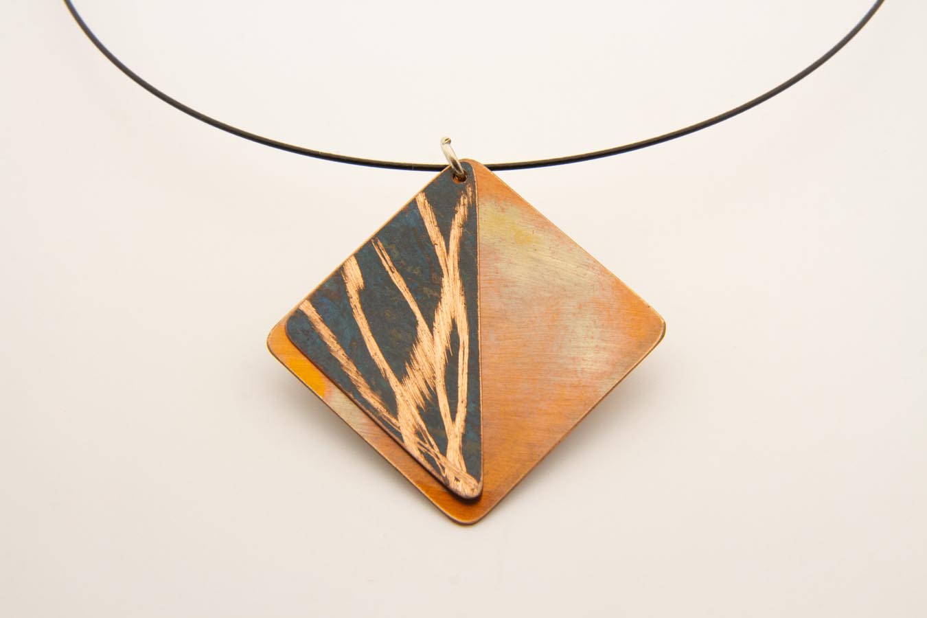 Collana con pendaglio mobile doppio e piatto, con base in rame ossidato a caldo e pezzo triangolare in rame ossidato a freddo, con lavorazione