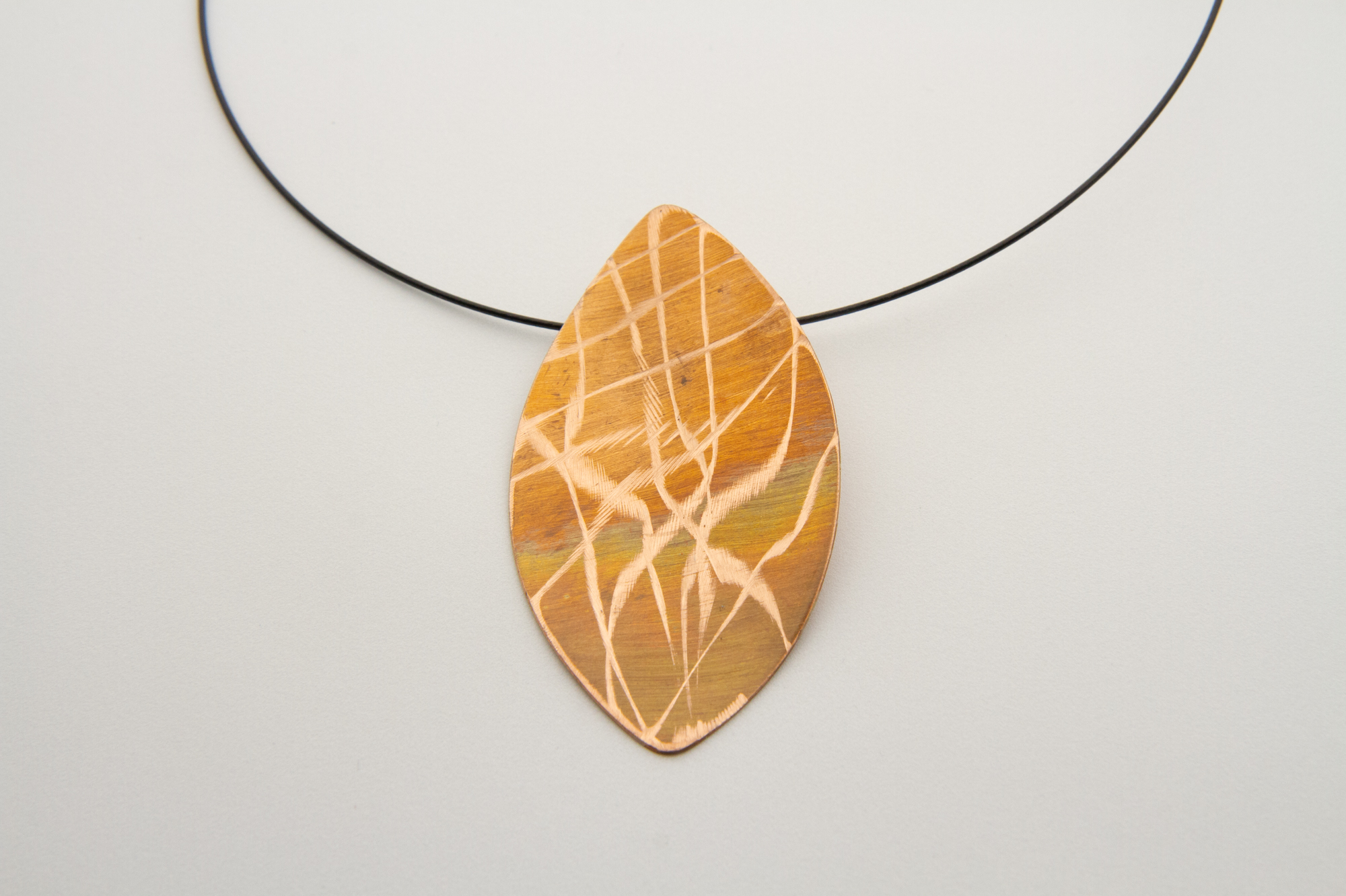 Collana con pendaglio mobile leggermente piegato, a forma di foglia, in rame ossidato a caldo, con lavorazione