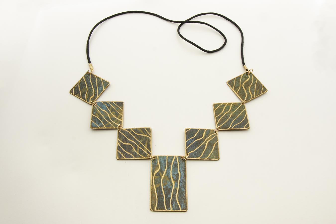 Collana a tessere mobili composta da sei pezzi quadrati ed uno principale rettangolare, in rame ossidato a freddo, con lavorazione. Filo in cotone satin