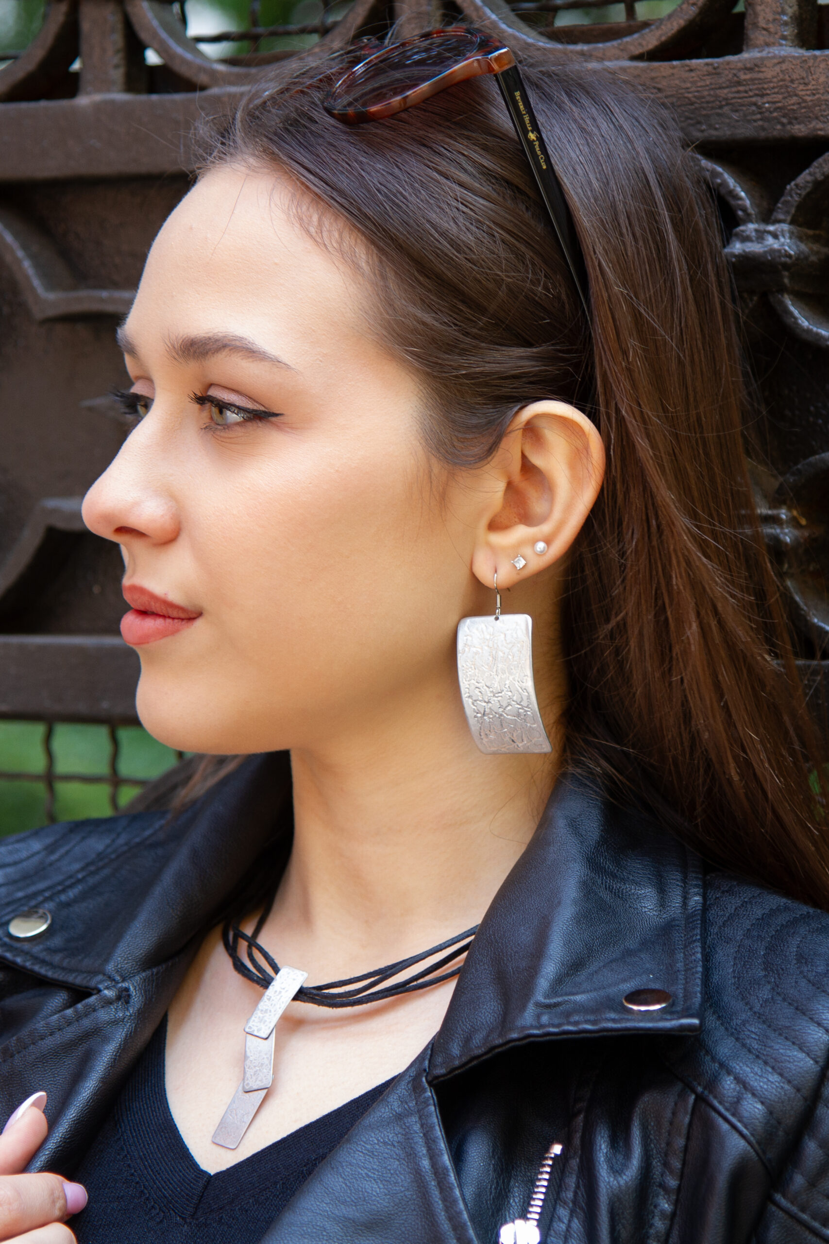 Orecchini rettangolari in alluminio, monachelle in materiale anallergico e chiusure in silicone trasparente. Dimensioni 2,5 x 5 cm.