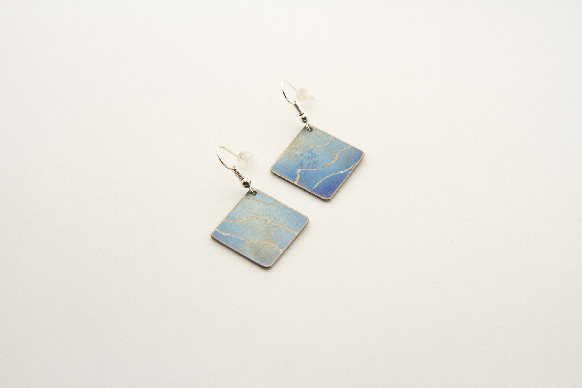 Orecchini a rombo piatti in titanio ossidato, con incisione a righe ondulate orizzontali