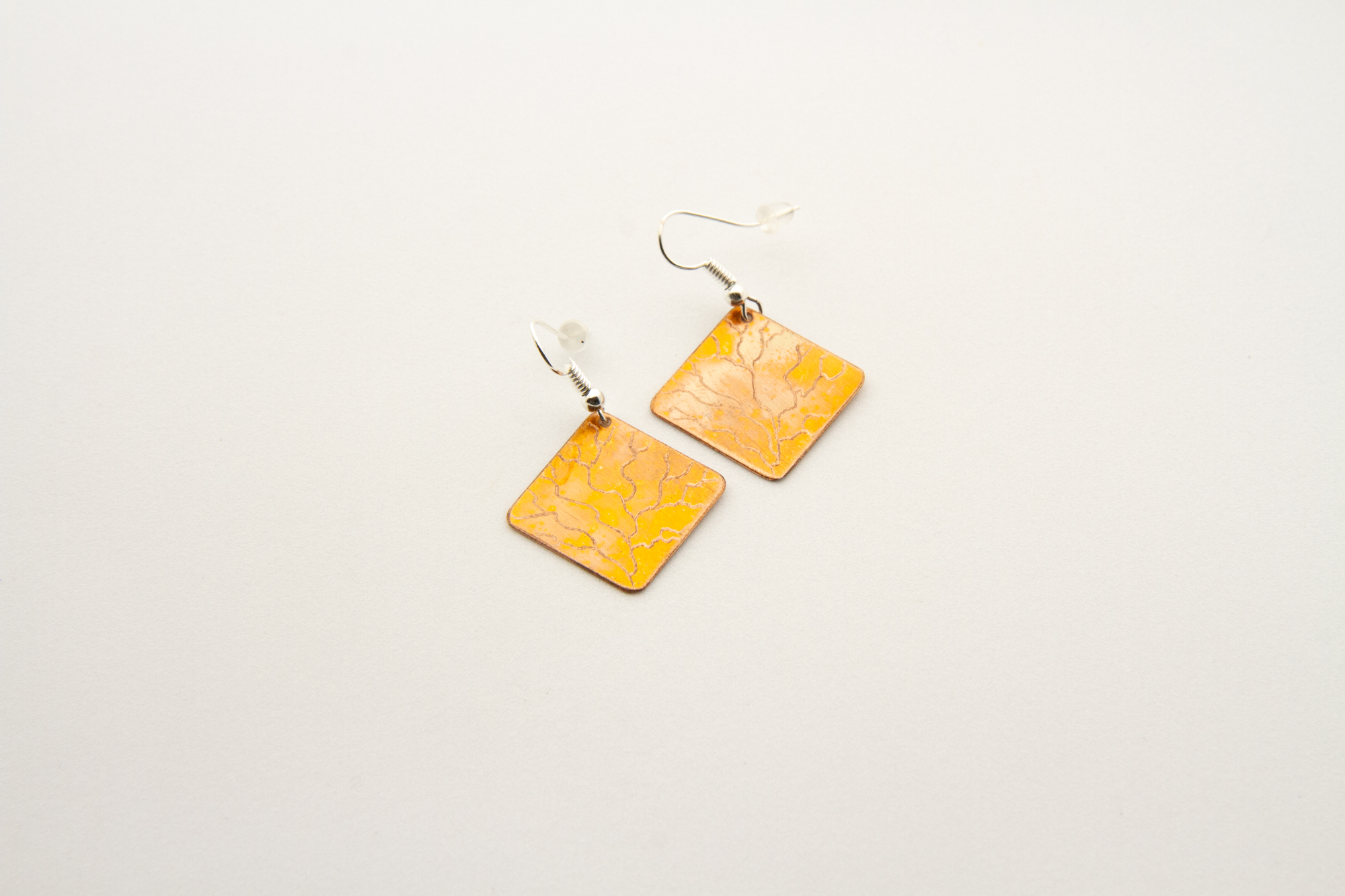 Orecchini a rombo in rame ossidato a caldo, con incisione ramificata. Misura piccola