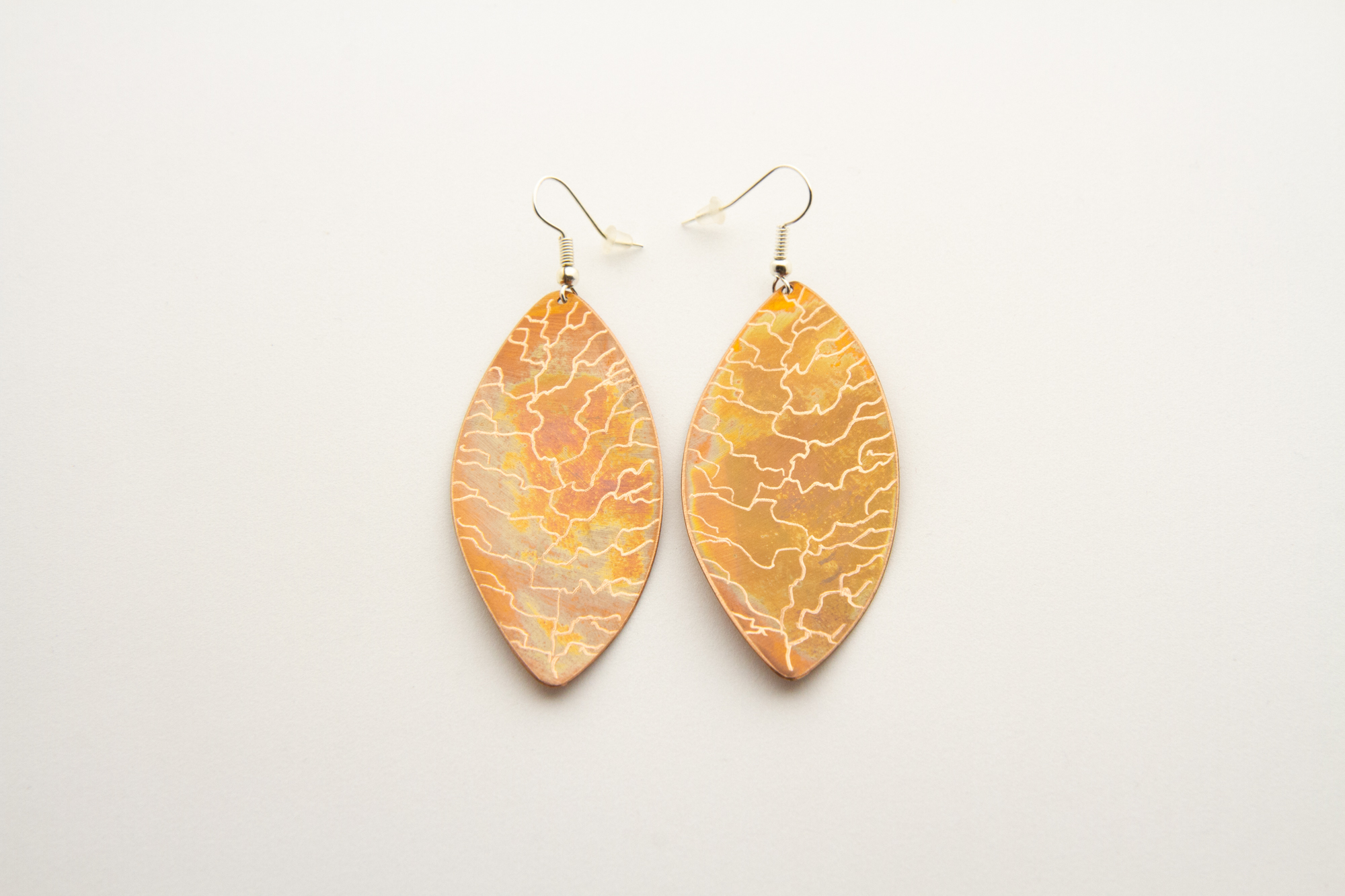 Orecchini realizzati in rame ossidato a caldo a forma di foglia. Gancetti in materiale nickel free. Chiusure gancetti in silicone