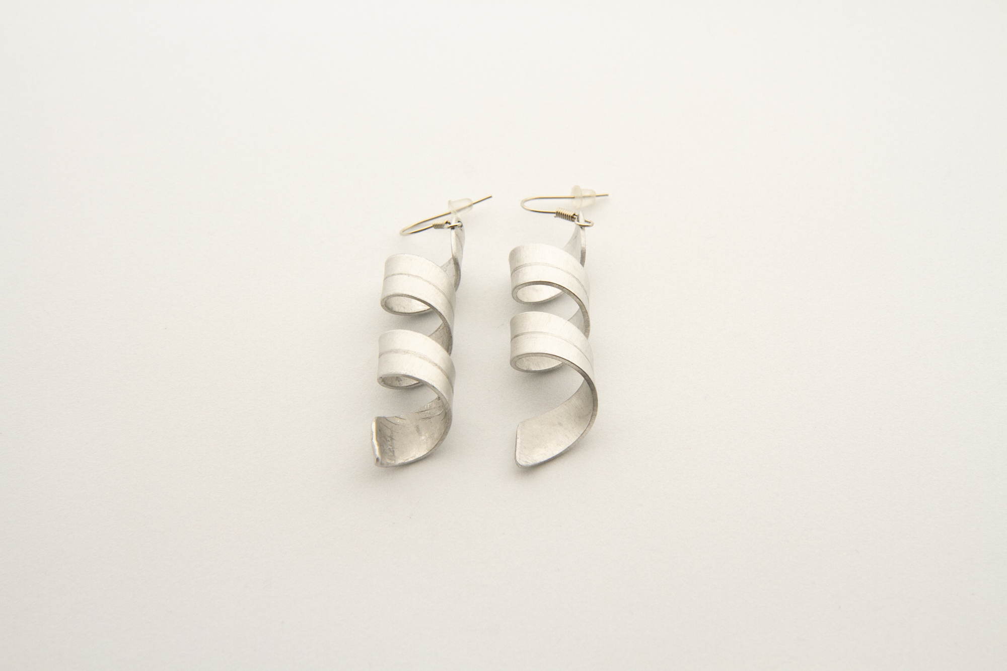 Orecchini realizzati in alluminio riciclato, a forma di spirale. Gancetti nickel free. Chiusure trasparenti in silicone