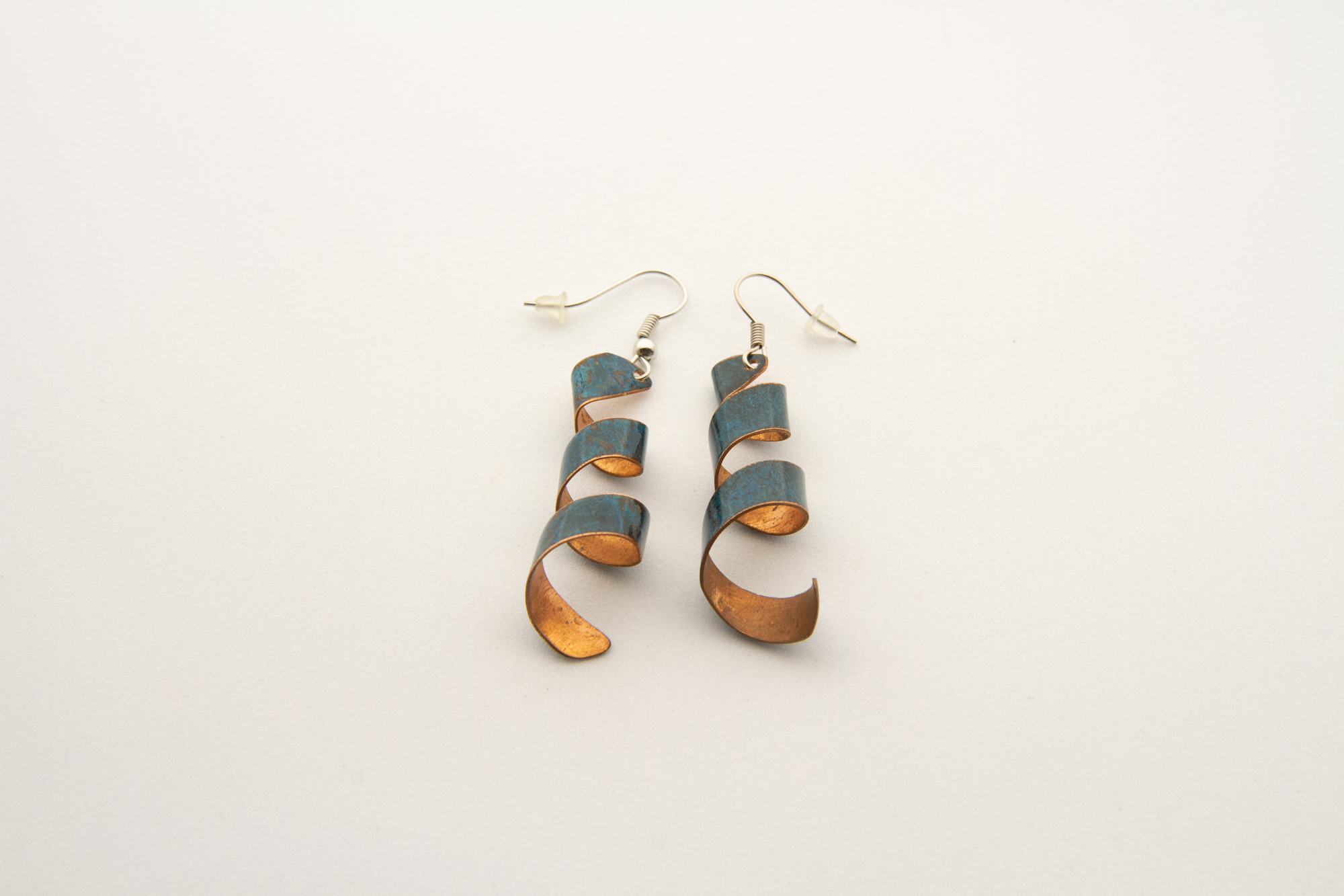 Orecchini a forma spiroidale realizzati in rame ossidato a freddo. Gancetti nickel free. Chiusure in silicone