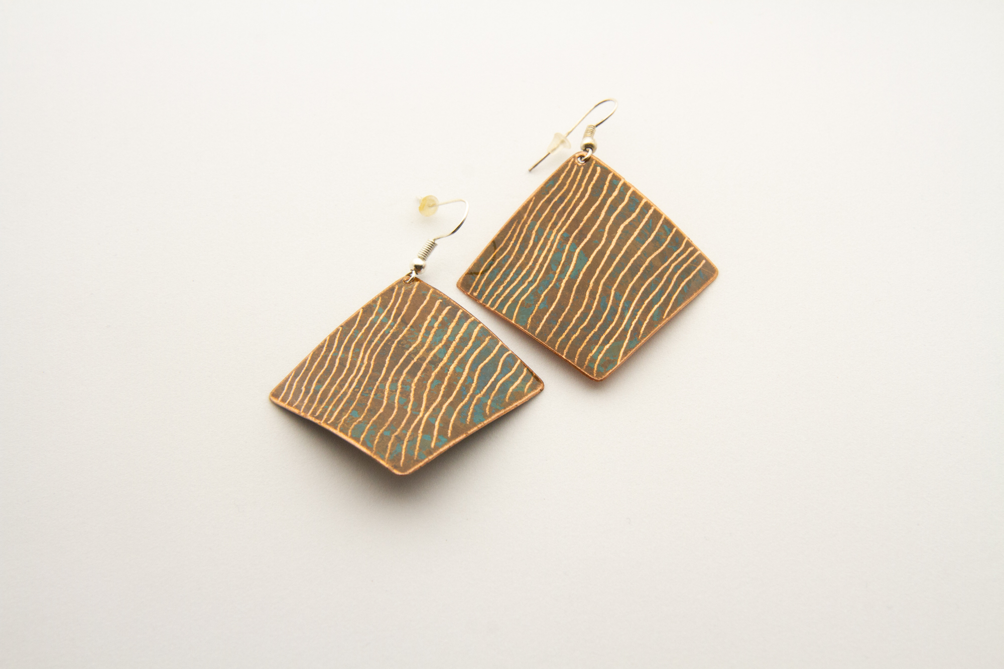 Orecchini a rombo in rame ossidato a freddo con incisione a righe. Misura media: 3,5 x 3,5 cm