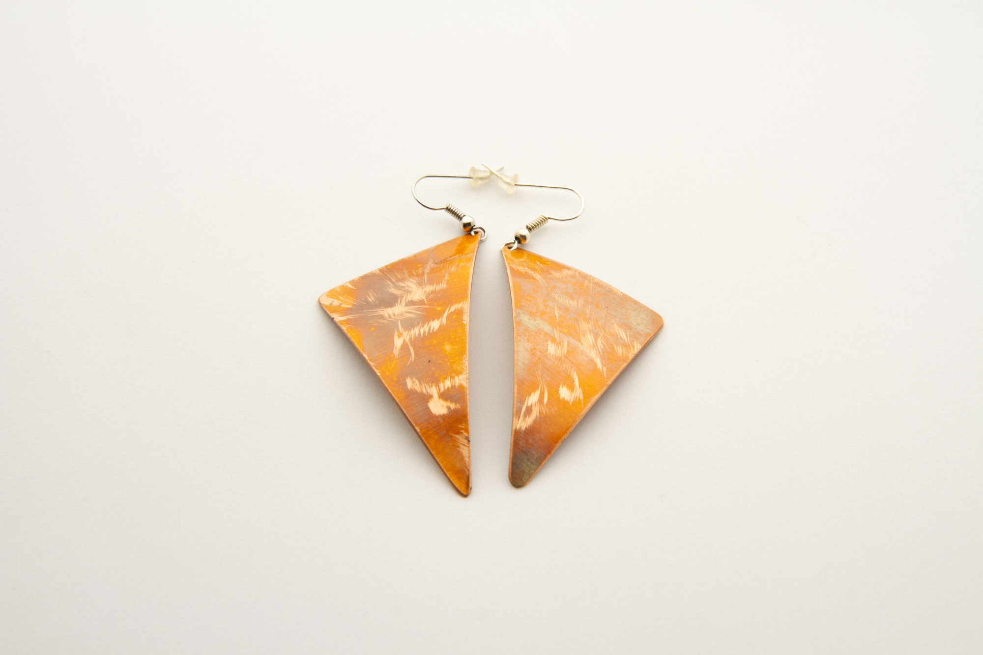 Orecchini a triangolo in rame ossidato a caldo, con lavorazione