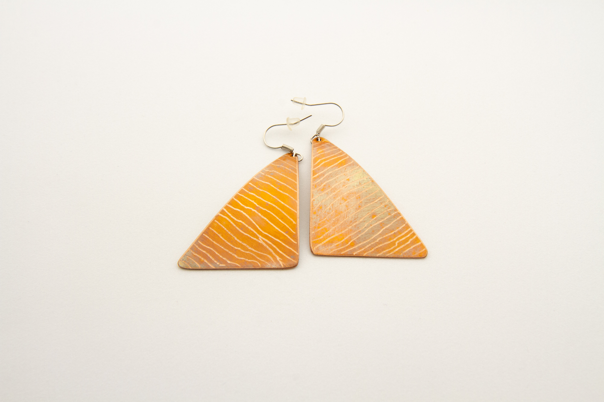 Orecchini a vela in rame ossidato a caldo con lavorazione ad incisione a righe