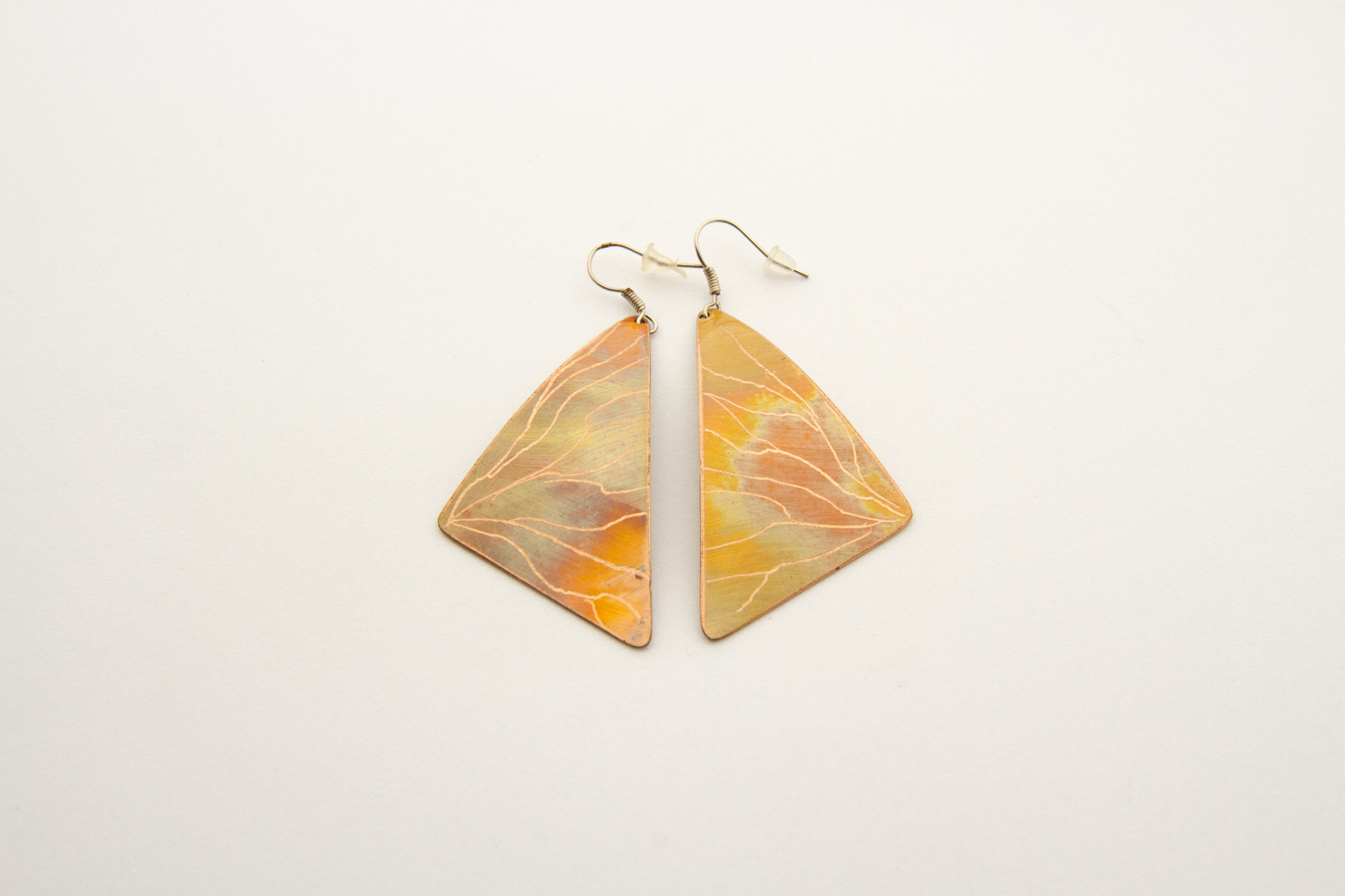 Orecchini a vela in rame ossidato a caldo, con lavorazione incisa ramificata
